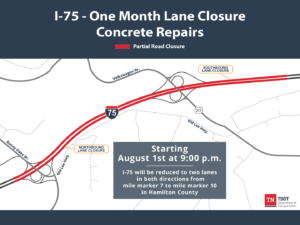 As part of the project to repair damaged concrete slabs, perform bridge repairs, and install new pavement markings, Tennessee Department of Transportation contract crews must implement lane closures on I-75 in both directions. Beginning Monday, August 1, 2022, at 9:00 p.m. ET, I-75 will be reduced to two lanes in each direction for one month from mile marker 7 (near the Bonny Oaks Drive exit) to mile marker 10 (between the Volkswagen Drive exit and the Ooltewah exit).